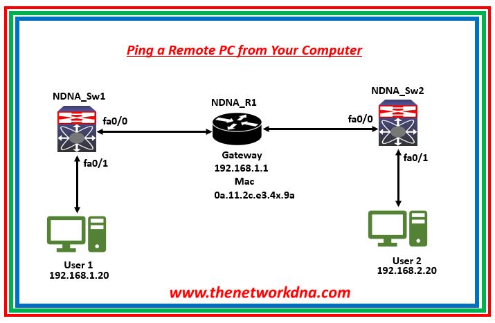 Step 1: User1 pings remote User2. As two PCs are separated by a router, they must be on different networks (subnets). User1 determines that destination IP is on remote networks using ANDing method of bit calculating, so User1 will use its Default Gateway.