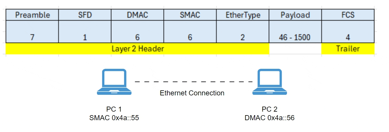 Destination MAC (DMAC): Identifies the NIC of the destination system. In this case PC-2 reads the MAC address and knows DMAC contains its MAC address and I should accept the frame. All other systems on the LAN read the MAC and ignore the frame as the message is not for them as the DMAC value does not match with their hardware address.