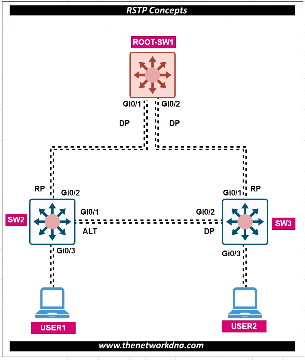 In Figure 2, Root Ports & designated ports are selected using the same rules as STP. However, in RSTP, Switch 2 picks G0/1 as an alternate port. An alternate port is the second-best option for the root port. This alternate port rapidly transitions to the root port in case there is an issue with the current root port without waiting for any timer to expire or going to multiple transient states.
