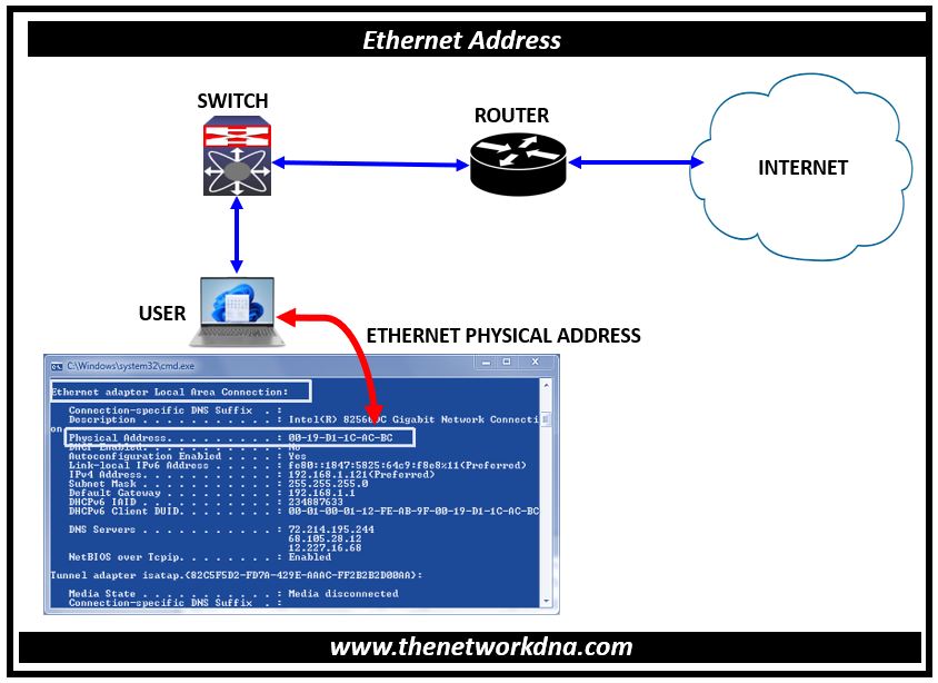 You can find the Ethernet Address of your PC by typing the “ipconfig /all” command in the command prompt. In the output, search for the Physical Address which is the Ethernet Address for your system.