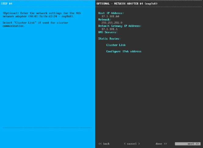 You need to configure the adapters with the IP address and the subnet Masks as shown below. This interface can be used for intra Cluster communications. Connect to access switch with connections to other nodes in the cluster. Also provide a default Gateway and a DNS Server. If needed provide a static route, or leave it blank. Once done Click next.