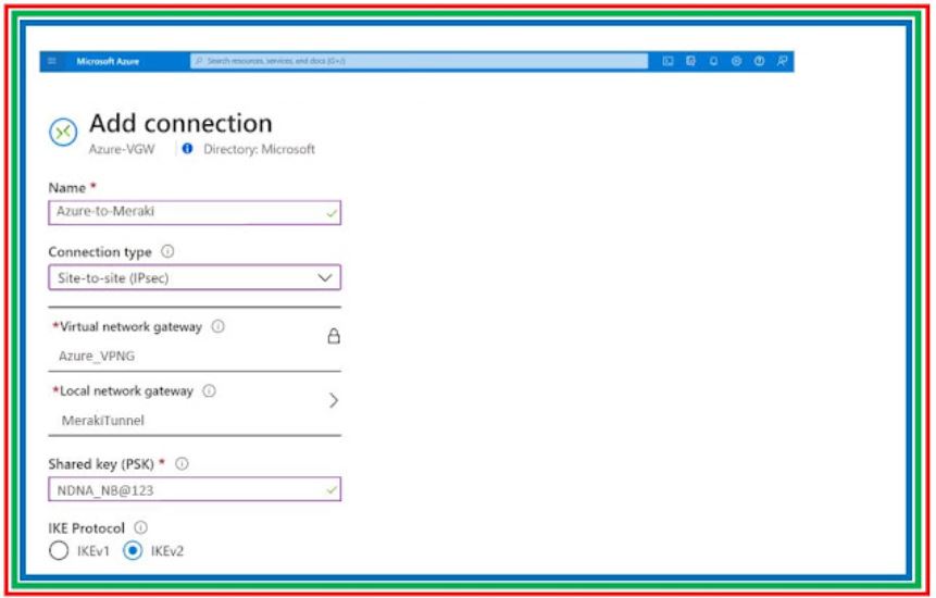 Step 3: As you are going to use Meraki MX device to create the tunnel with the Azure Gateway. you need to put the same shared key that you specify when creating your Site-to-Site VPN connection.