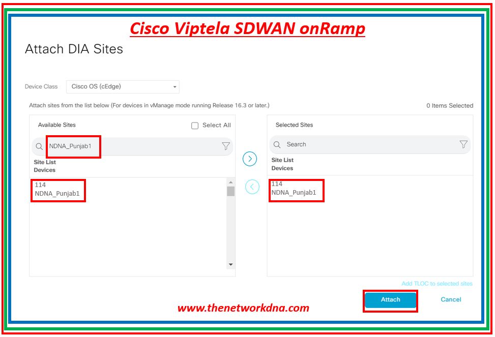 Step 3: Now Attach DIA sites as shown below, When you are attaching devices, there are two options and these are ( Cisco OS - cEdge and Viptela OS - vEdge), Select the device which needs to be added on the DIA sites.