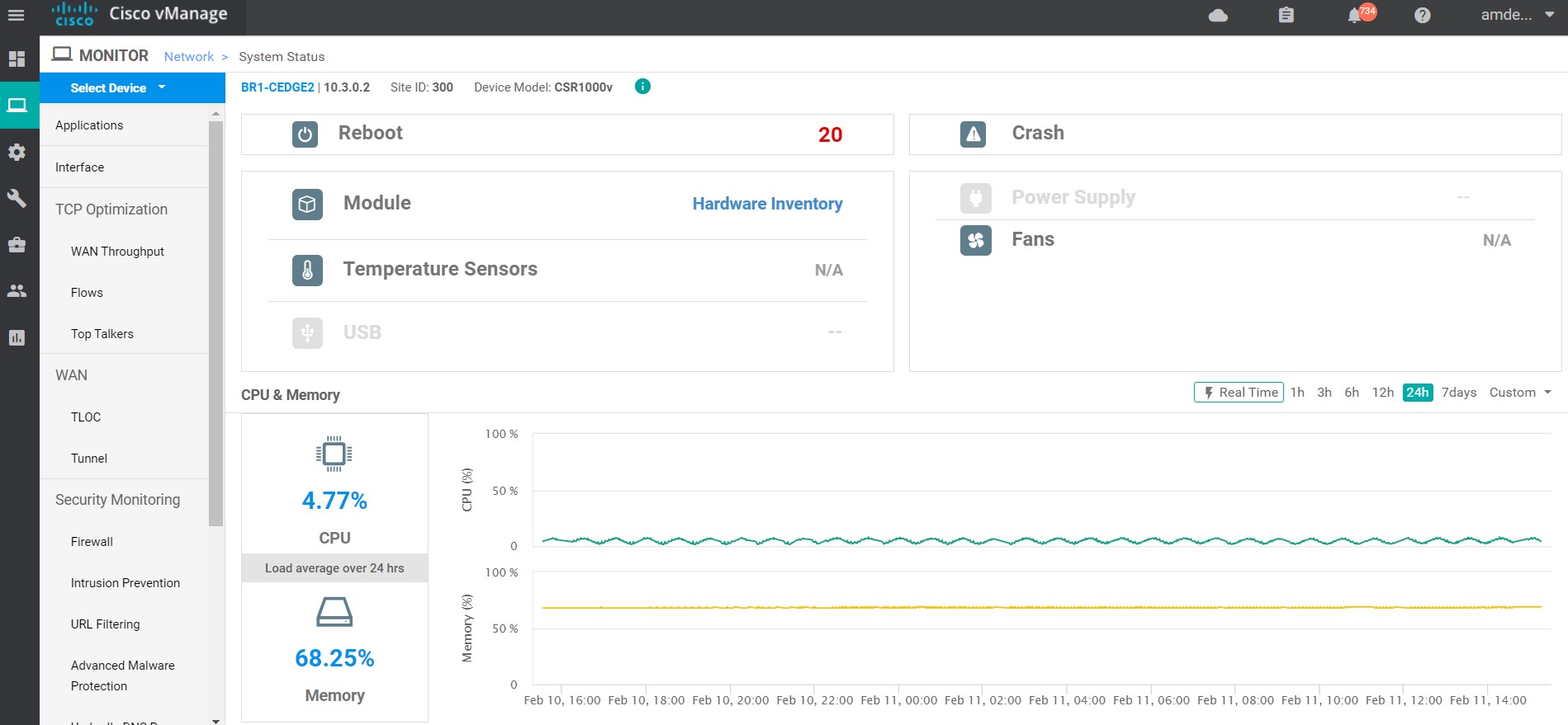 Device 360 view provide the detailed visibility on how the device is working and the critical health parameters such as reboots, fan & power status, temperatures, CPU and memory utilization (real-time and historical).