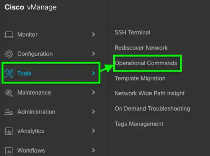 1. From the Cisco SD-WAN menu, choose Tools > Operational Commands.