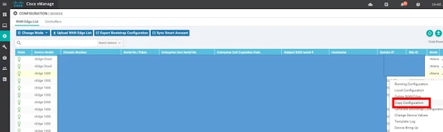 Step 2: From the list of vEdge routers, locate the failed router and Click the More Actions icon to the right of the row and click Copy Configuration.