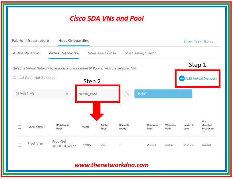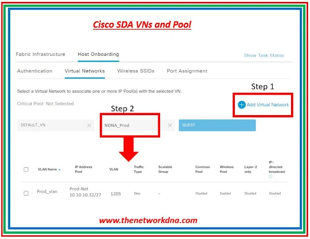 IP address pools can be assigned to unicast or multicast virtual networks (VN) defined in your SD-Access Fabric. So step 1 is to create a Virtual network by adding it and then click that created VN. Once clicked you will see there to define the IP and Pool type, Define that and you VN is ready.