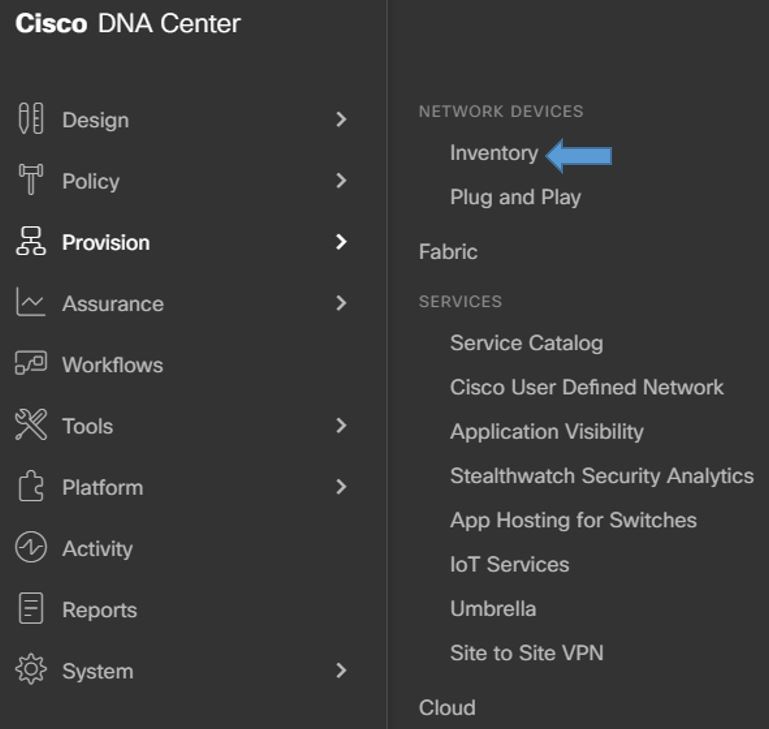 Click on Cisco DNA Center --> Provision --> Inventory as shown below in the image.