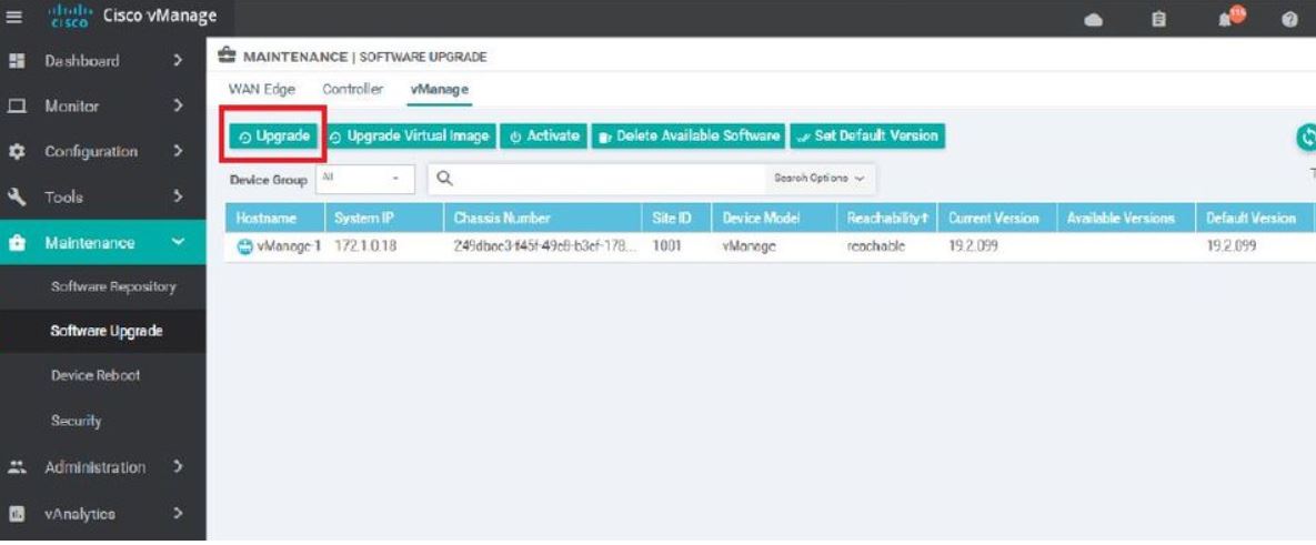 On the top, there are 3 tabs, WAN Edge, Controllers and vmanage, Click on vManage tab and on the top it will shows upgrade button, Click on the same.