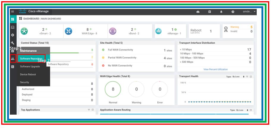Step 1: Login to the vManage and check if the Software repository has the latest image which needs to be upgraded on the vEdge as per the requirement.