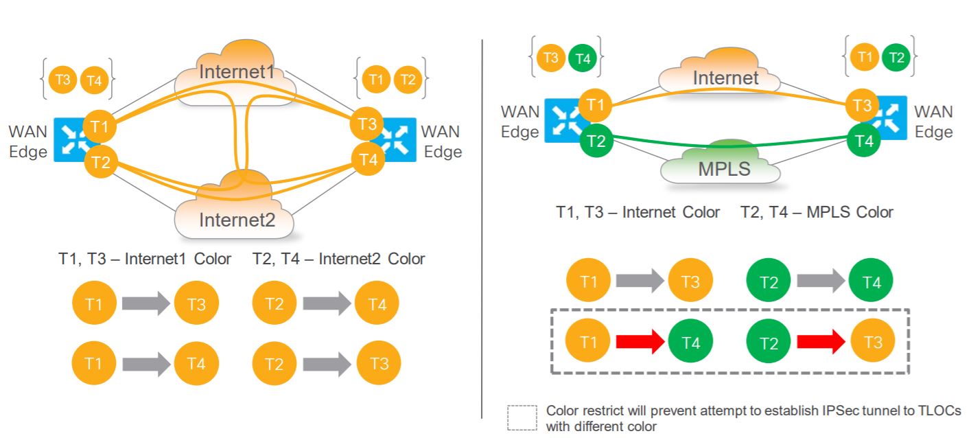 Cisco Viptela term TLOC color as Public and Private. Dont confuse with the color, color is basically used to categorized WAN circuits on vEdges. The specific color used is categorized as Private or Public.